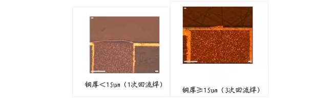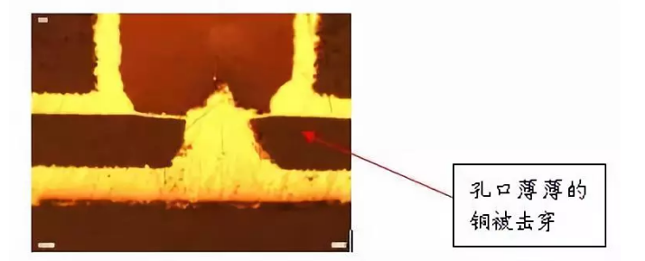 D、對于樹脂與銅分層的問題,我們發(fā)現(xiàn)孔表面的銅厚厚度大于15um時(shí),此類樹脂與銅分層的問題可以得到極大的改善。(如下圖)